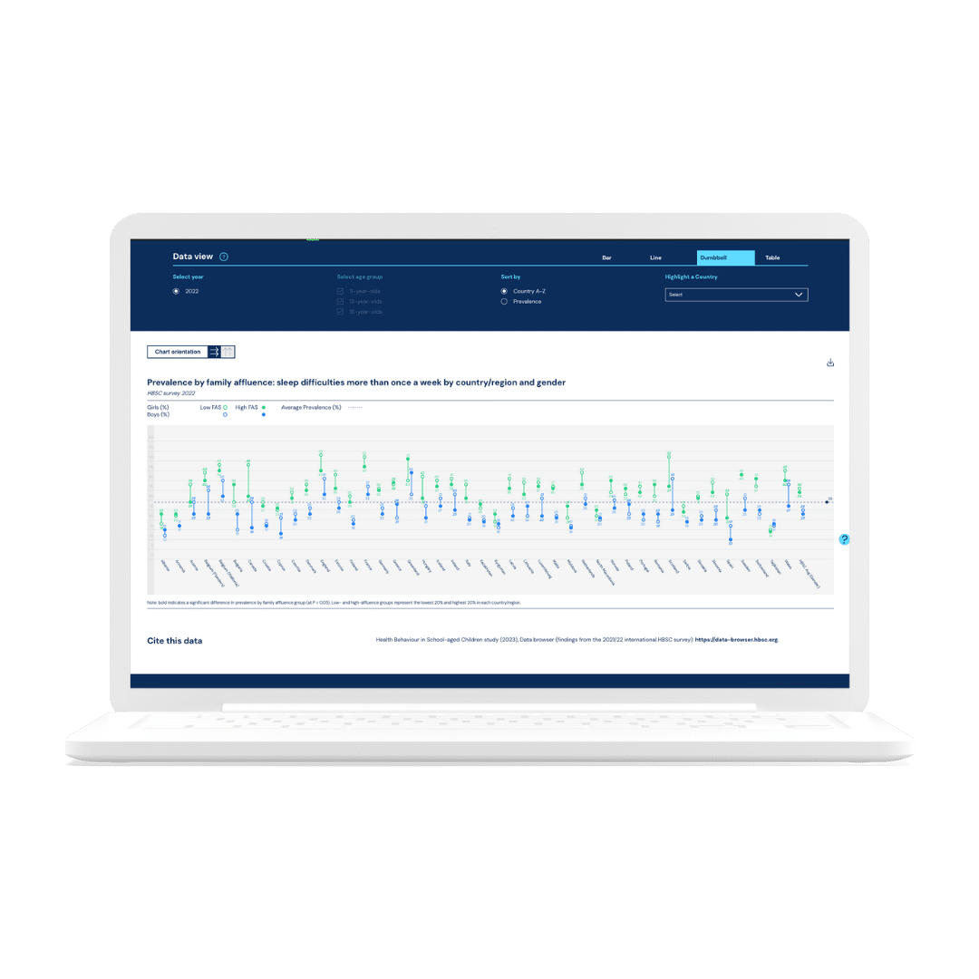 Dive into HBSC study’s data on adolescent health and well-being. Explore, compare and share cross-national results from the latest international survey in 2022, alongside comparable figures from the HBSC surveys in 2014 and 2018.